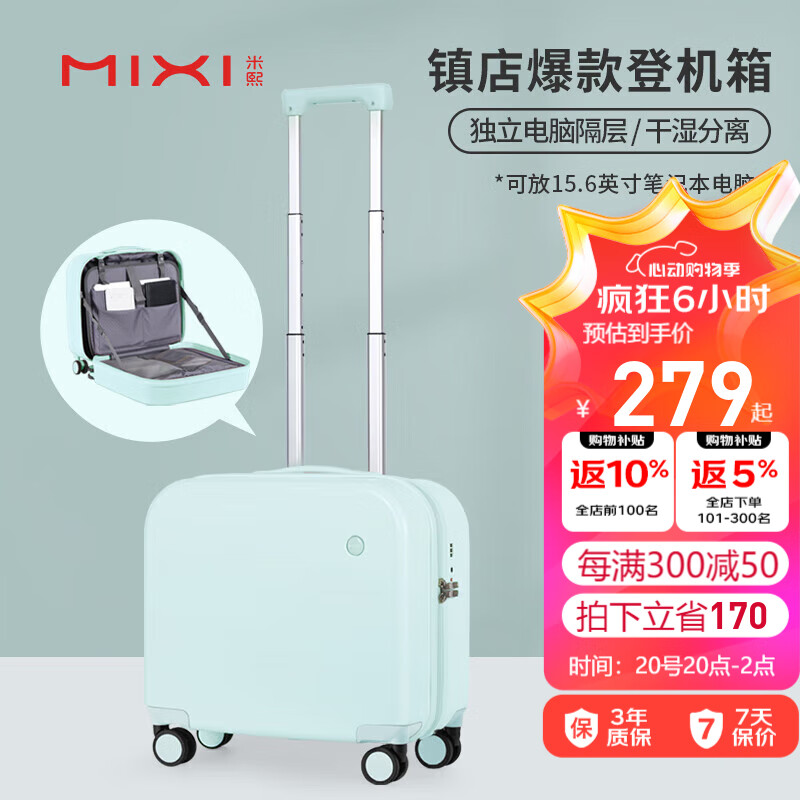 米熙高颜值登机箱小行李箱女拉杆箱子旅行箱男密码箱包18英寸薄荷绿36价格:449.00元!
