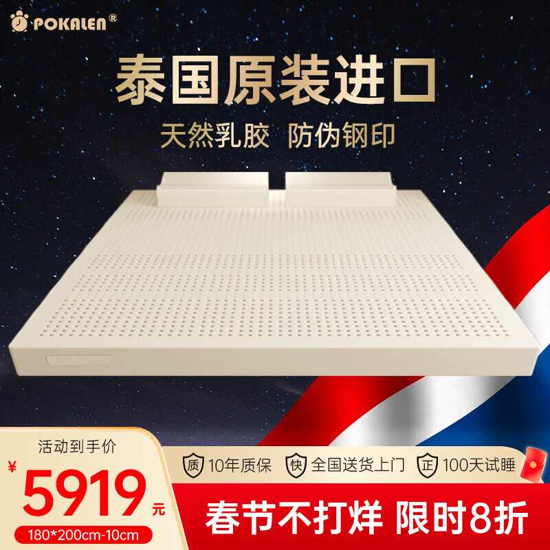 POKALEN乳胶床垫 泰国原装进口天然橡胶榻榻米席梦思垫单双人床垫 10CM厚-100D韧硬有力 180*200cm-配天丝床套价格:7399.00元!