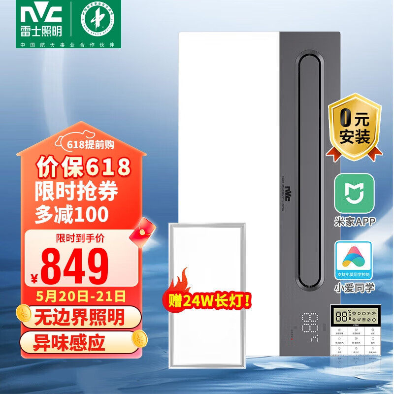 雷士(NVC)米家智能无边界除菌浴霸暖风照明排气一体机卫生间浴室集吊Y332价格:1349.00元!