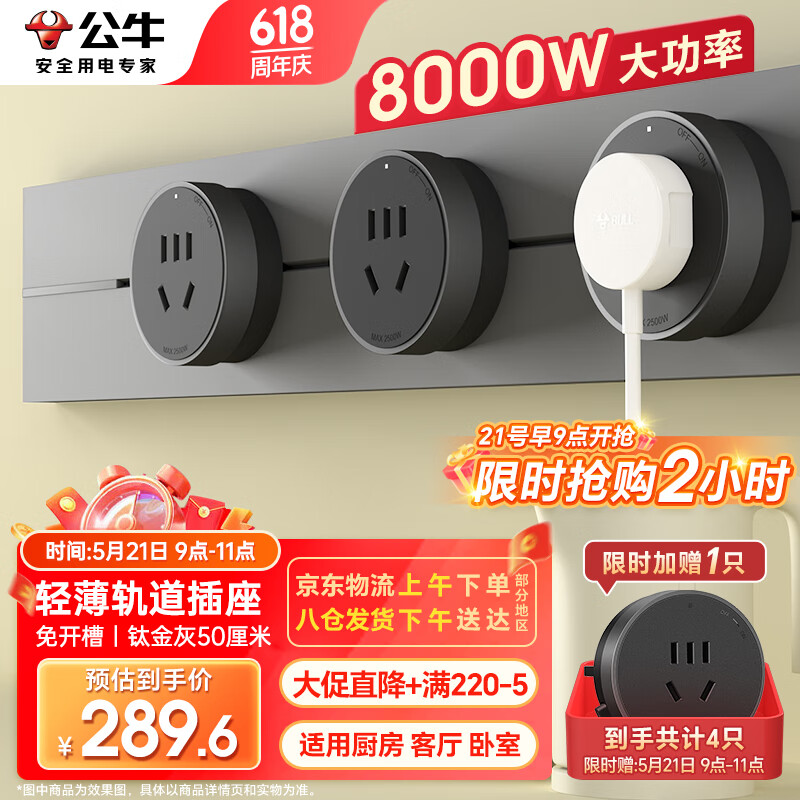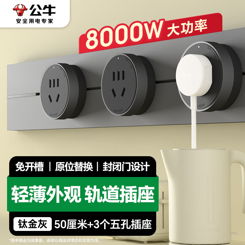 公牛(BULL)明装 轨道插座 大师轻薄款可移动墙壁插座壁挂式滑轨插座 免打孔 50厘米轨道+3个五孔 钛金灰价格:294.60元!