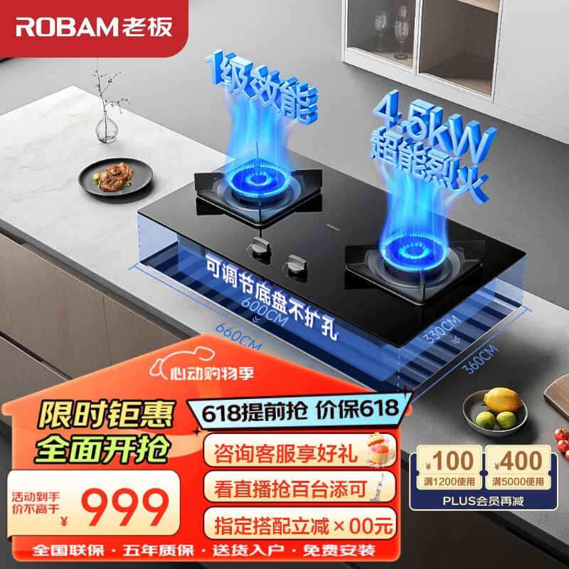 老板(Robam)JZT-30B6D家用燃气灶天然气双灶嵌入式煤气灶 4.5kW小尺寸可调节灶具灶台猛火灶燃气灶一级能效价格:999.00元!