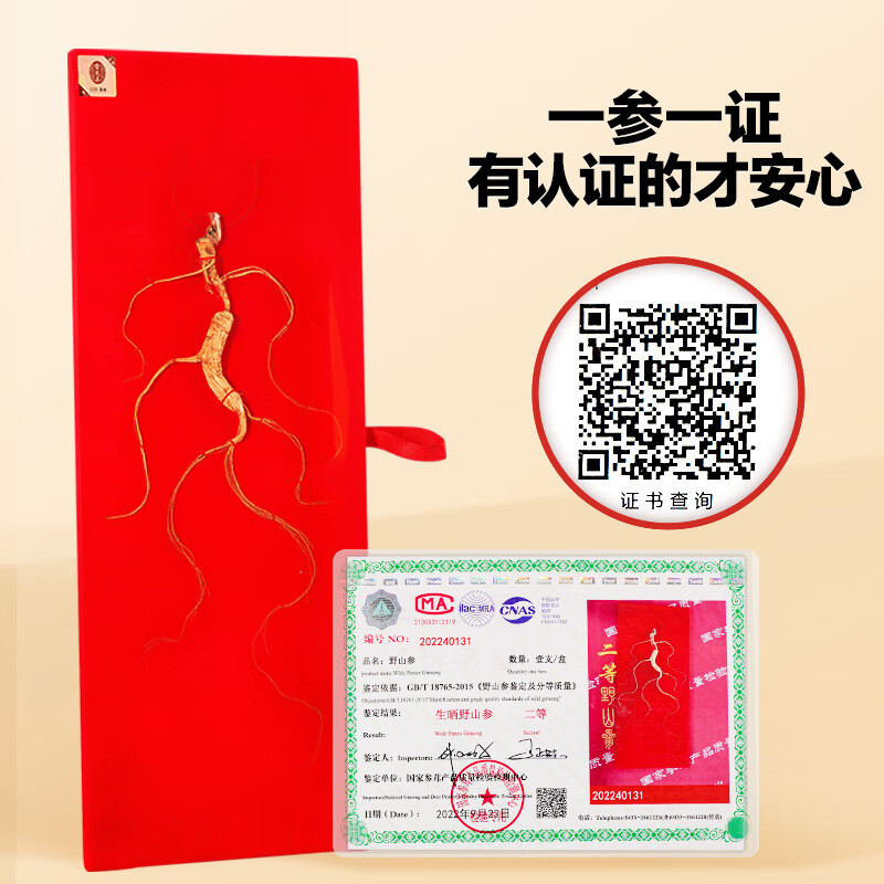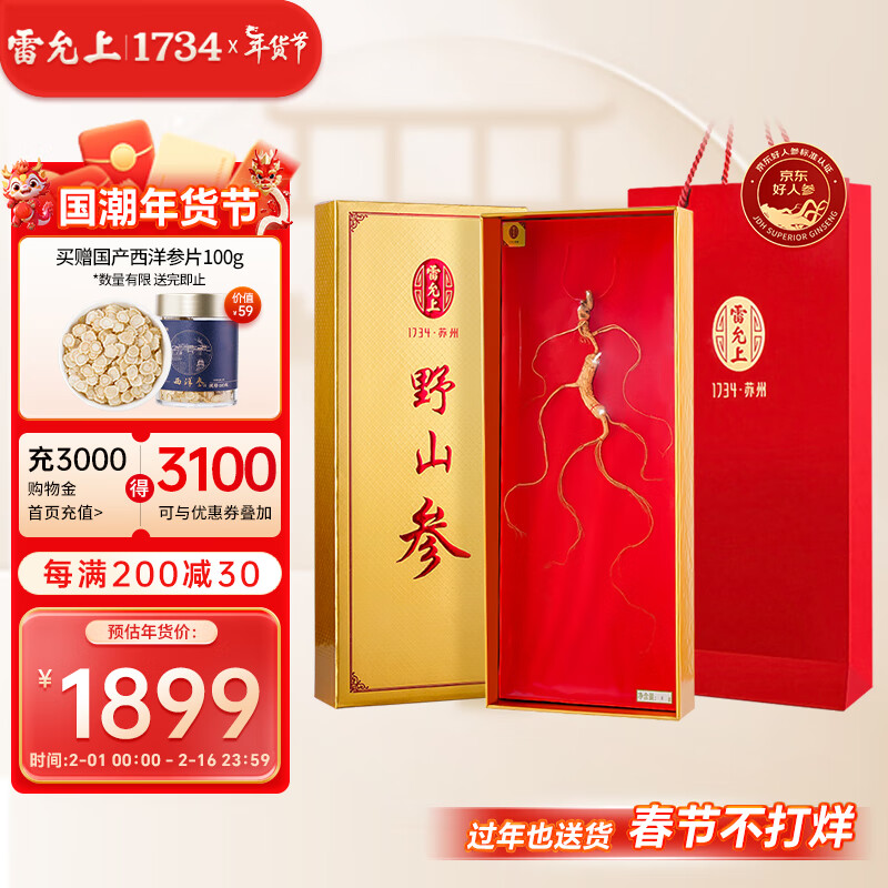 雷允上 野山参 年货礼盒 长白山林下参整支人参生晒参 国检二等15年林下山参五级4g 泡酒送礼价格:2199.00元!