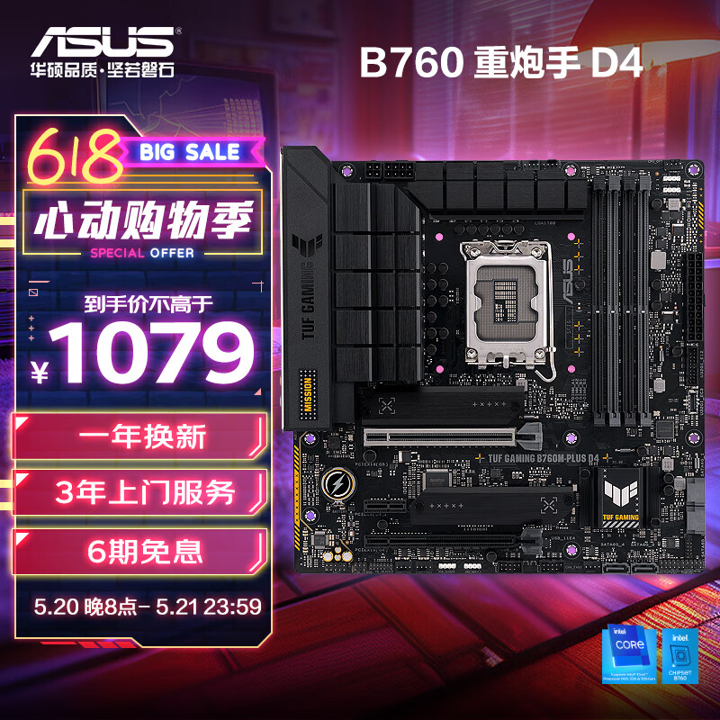 华硕(ASUS)TUF GAMING B760M-PLUS D4重炮手主板 支持 CPU 13700K/13600KF/13400F(Intel B760/LGA 1700)价格:1079.00元!