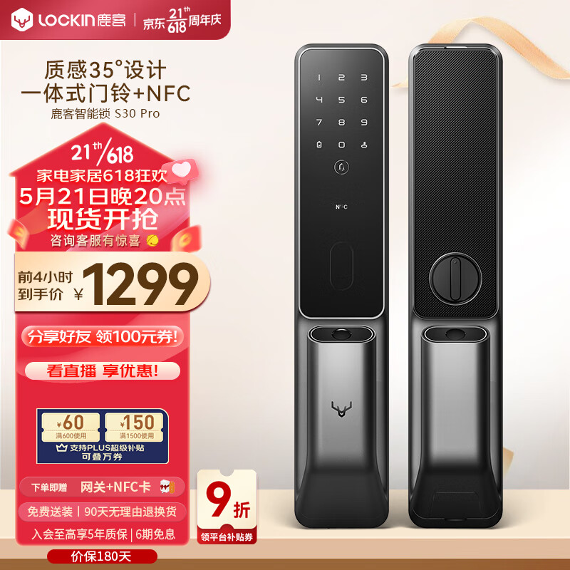 鹿客(lockin)S30Pro内置门铃全自动智能门锁指纹密码电子锁支持APP智能联动价格:1549.00元!