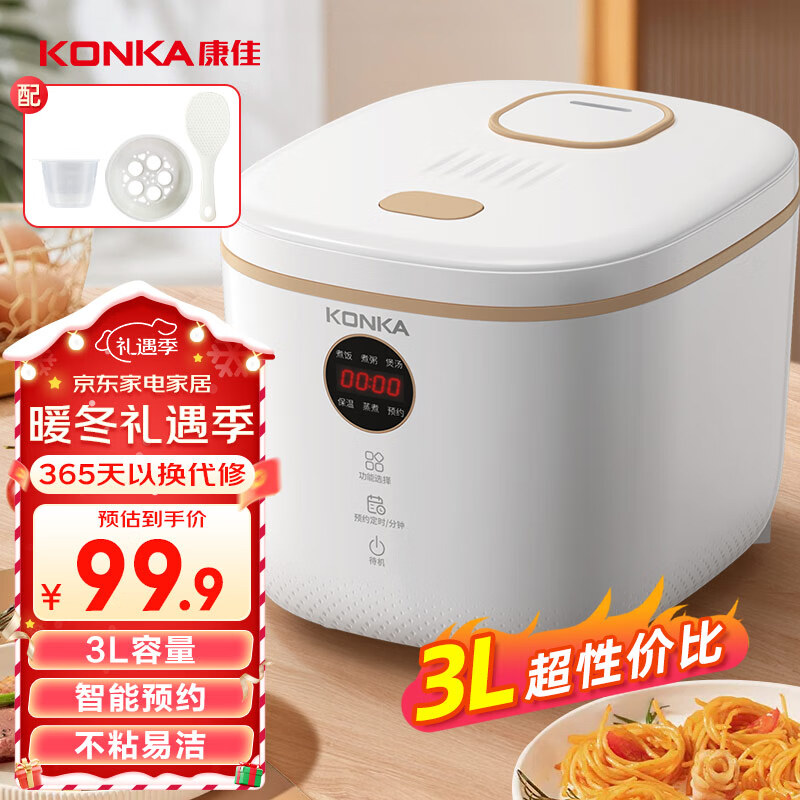 康佳(KONKA)电饭煲 家用智能预约 3L大容量2-6人煮饭煮粥锅辅食锅小电饭锅 KDFB-3020E-W价格:99.90元!