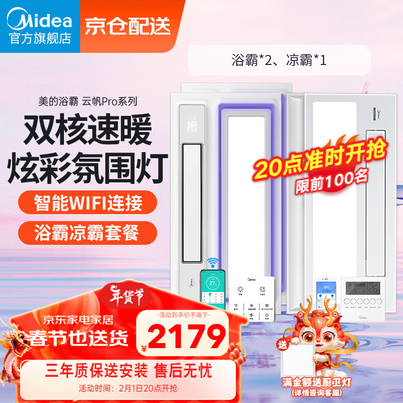 美的(Midea)风暖浴霸排气扇照明一体暖风机浴室集成吊顶智能双电机云帆pro价格:2179.00元!