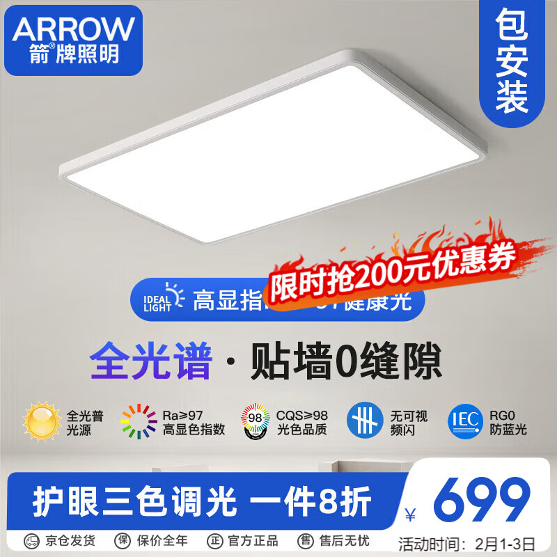 ARROW箭牌照明 全光谱护眼吸顶灯卧室超薄书房儿童房灯中山灯具JPXZ483价格:874.90元!