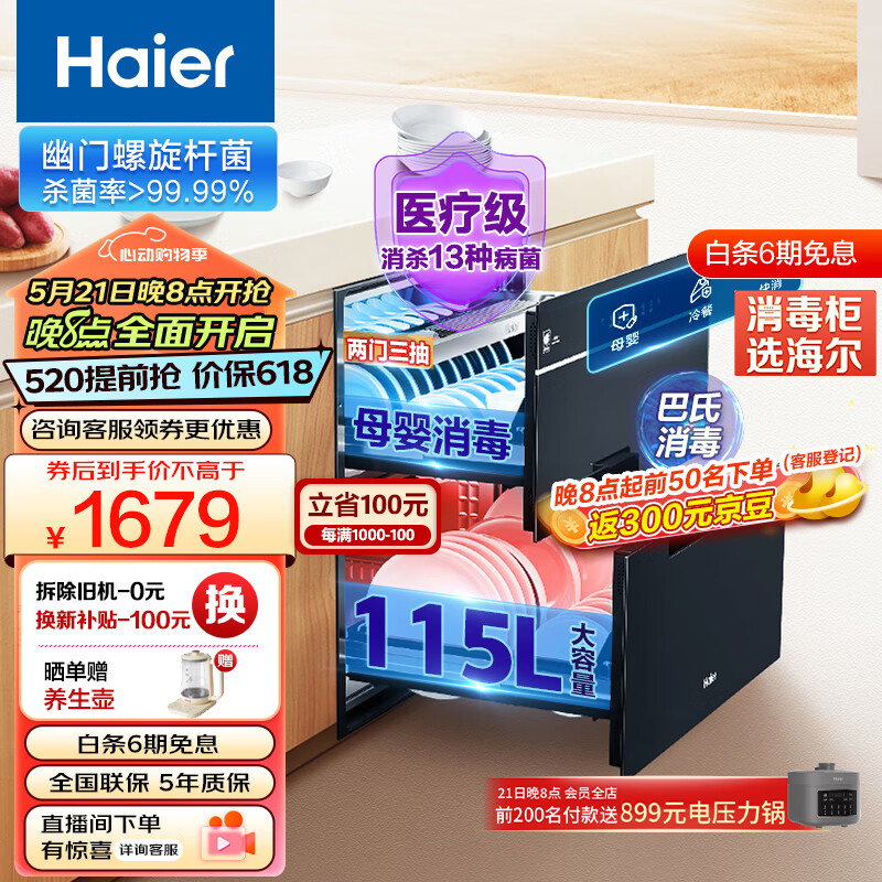 海尔(Haier)消毒柜嵌入式 115L三层双二星 家用消毒碗柜 紫外线+光波巴氏消毒新升级0臭氧 婴儿奶瓶E07JU1价格:1799.00元!