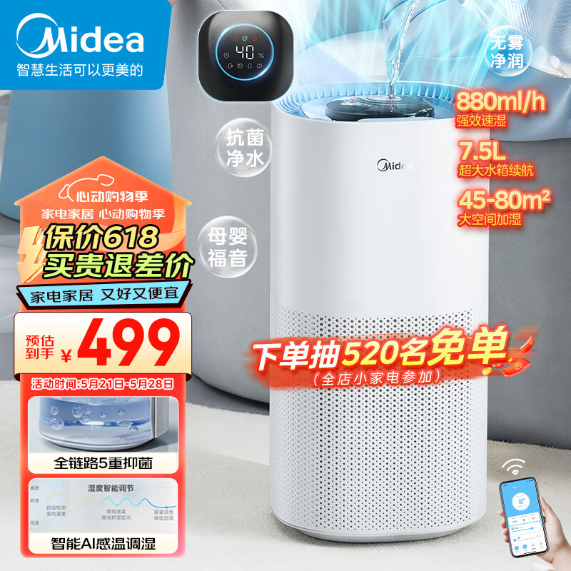 美的(Midea)【小蓝鲸800】无雾加湿器除菌卧室婴儿办公室家用工业雾化器大面积桌面空气净化加湿器生日礼物价格:499.00元!