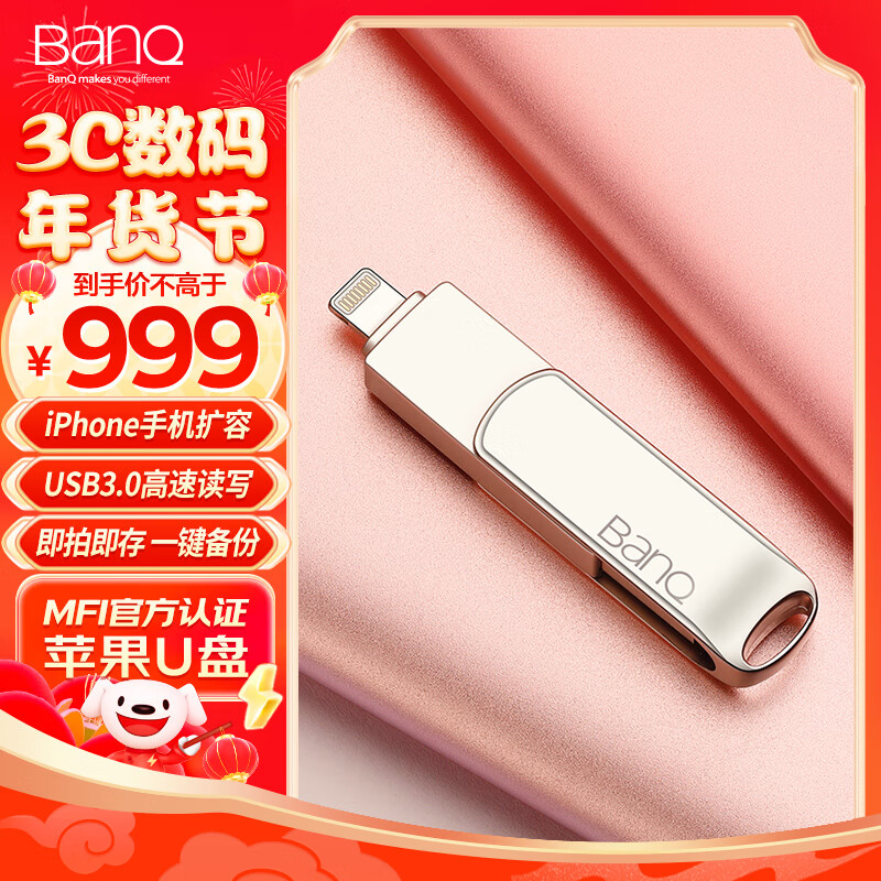 banq 1TB Lightning USB3.0苹果U盘 A50高速苹果MFI授权认证 iPhone/iPad双接口手机电脑两用U盘价格:999.00元!