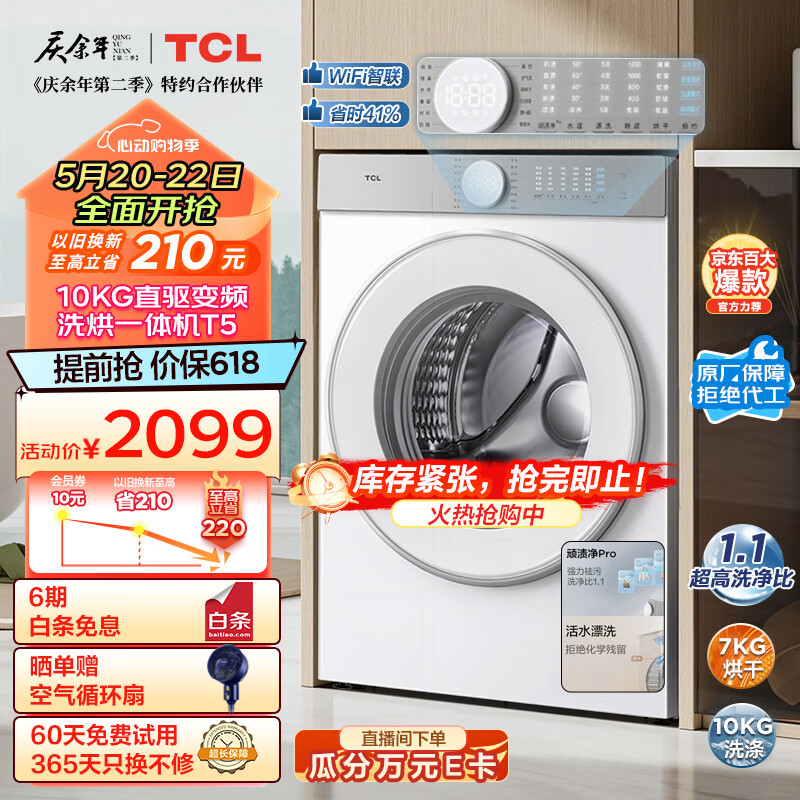 TCL 10KG直驱变频洗烘一体机T5 除菌除螨 洗净比1.1 顽渍净Pro 575mm超薄滚筒洗衣机 G100T5-HD价格:2299.00元!