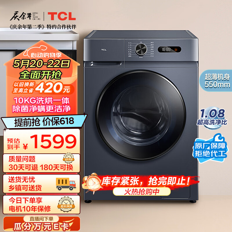 TCL 10KG变频滚筒L130超薄全自动滚筒洗烘一体洗衣机 高洗净比1.08 食用级巴氏除菌 G100L130-HB价格:1599.00元!