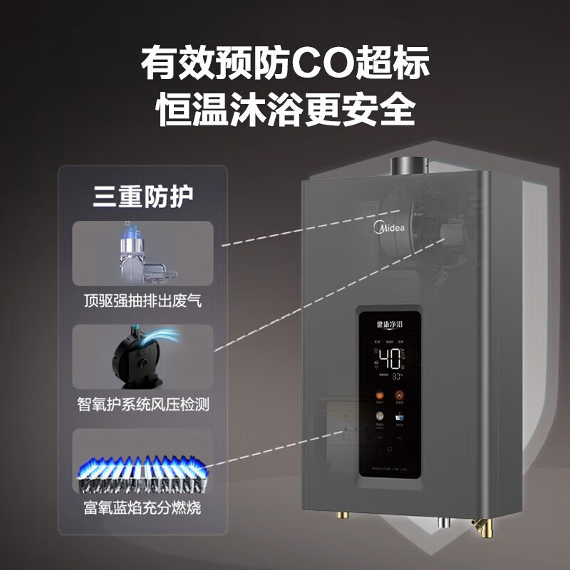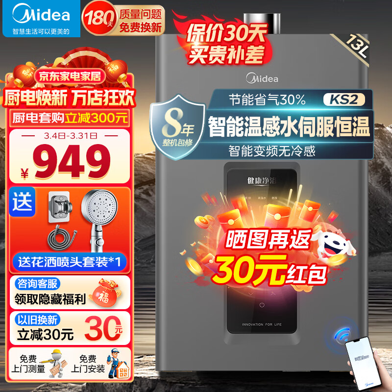 美的(Midea)13升燃气热水器燃气天然气家用洗澡即热式水气双调水伺服智控一键定制水温以旧换新JSQ25-KS2价格:949.00元!