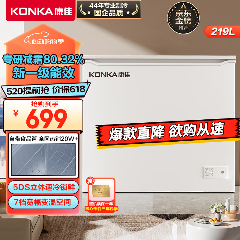 康佳219升一级能效减霜大容量冰柜家用商用小型冷柜冷藏冷冻转换囤货母婴节能卧式冰箱BD/BC-219DTH价格:699.00元!