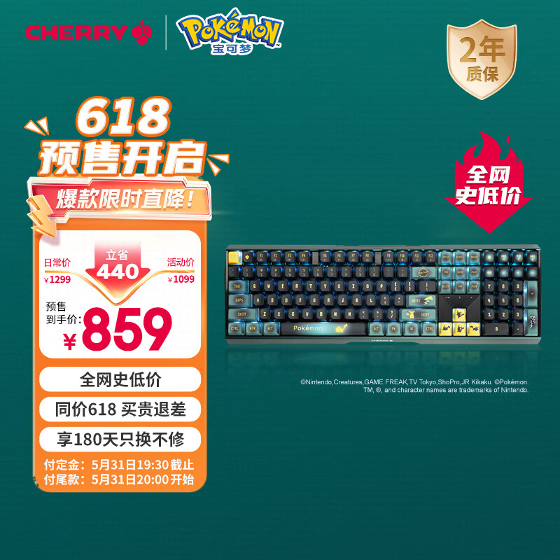 CHERRY樱桃 MX3.0S无线键盘 机械键盘 宝可梦联名款 皮卡丘键盘 三透PBT键帽 蓝牙有线三模 办公游戏键盘价格:1058.90元!