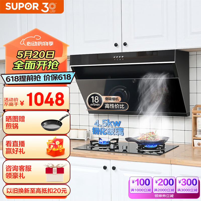 苏泊尔(SUPOR) 抽油烟机烟灶套装 18立方爆炒侧吸式家用吸油烟机燃气灶套装 以旧换新 DJ13+DB19天价格:1048.00元!