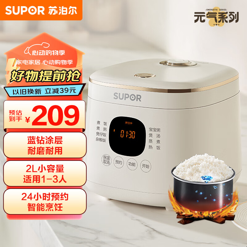 苏泊尔(SUPOR)电饭锅 2L小型电饭煲小容量1-3人 蓝钻内胆 24小时预约智能烹饪家用多功能智能电饭煲SF20FC945价格:209.00元!