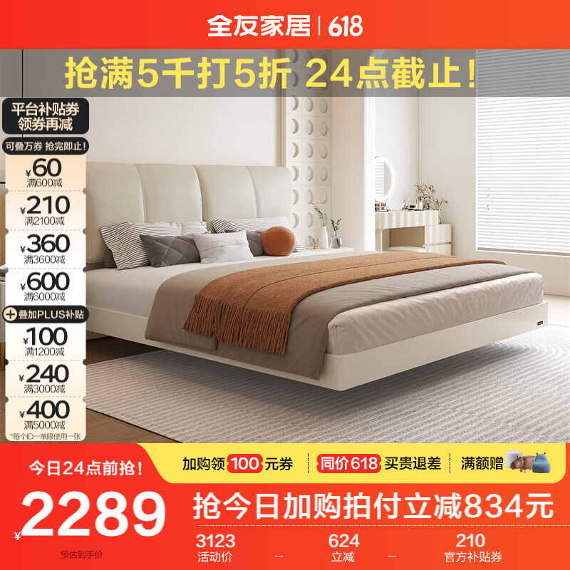 全友家居 现代简约大象耳朵皮艺软包床1.5米主卧室双人悬浮大床129303价格:3123.75元!