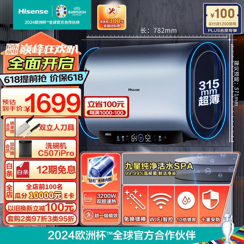 海信(Hisense)纤薄扁桶60升家用电热水器超薄双胆3200W速热电子镁棒一级能效10倍增容WIFI智能S7210i以旧换新价格:1899.00元!