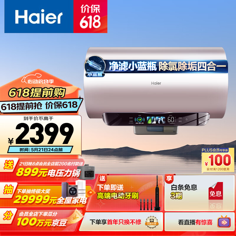 海尔(Haier)80升【小蓝瓶】瓷净美肤电热水器家用储水式3300W变频速热新一级能效免换镁棒大水量EC8002-WP3AU1价格:2599.00元!