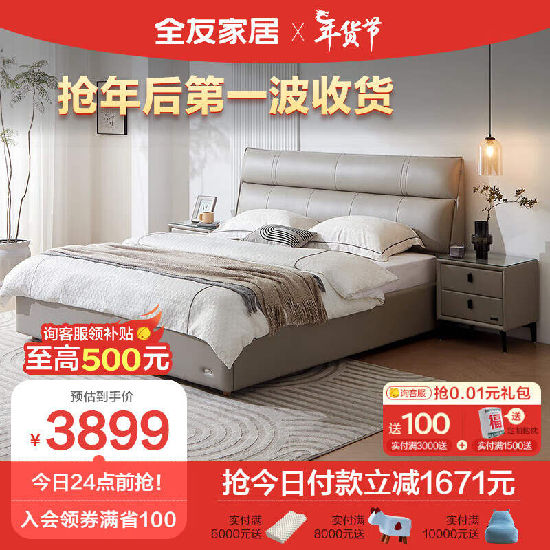 全友家居 现代简约头层牛皮双人床1.8米高箱分段靠包真皮储物床116033价格:5570.00元!