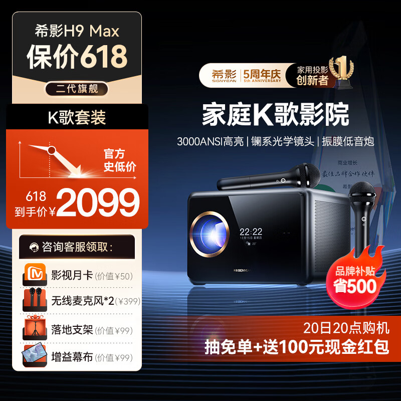 希影H9 Max二代 4K家庭K歌影院 家用投影仪 4K高清智能投影 卧室客厅投影机家庭影院 专属KTV价格:2599.00元!