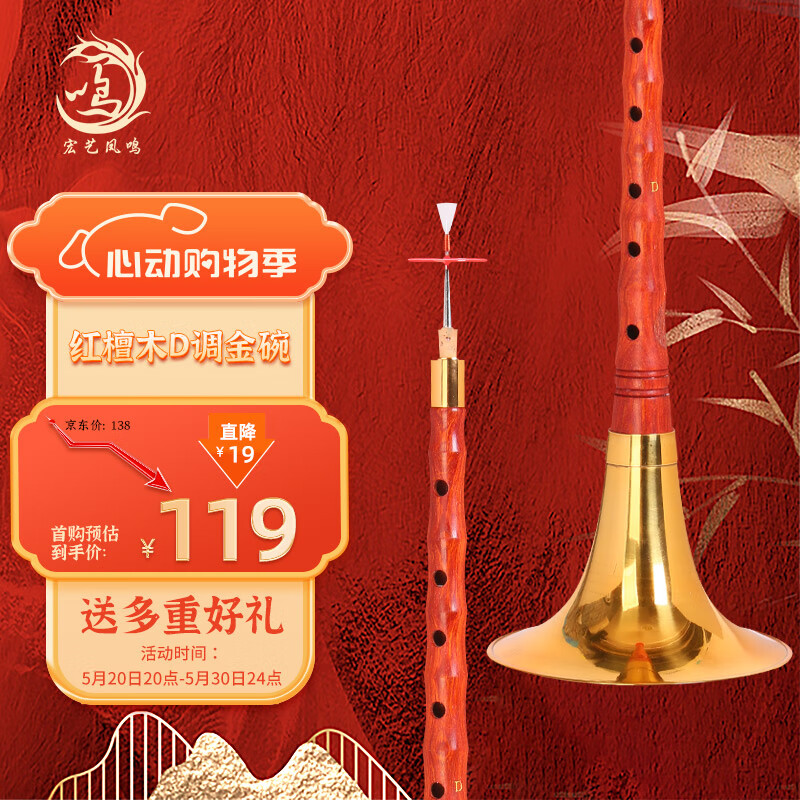 宏艺凤鸣(HongYiFengMing)红檀木D调金碗初学者成人入门通用教学曲谱唢呐全套价格:138.00元!