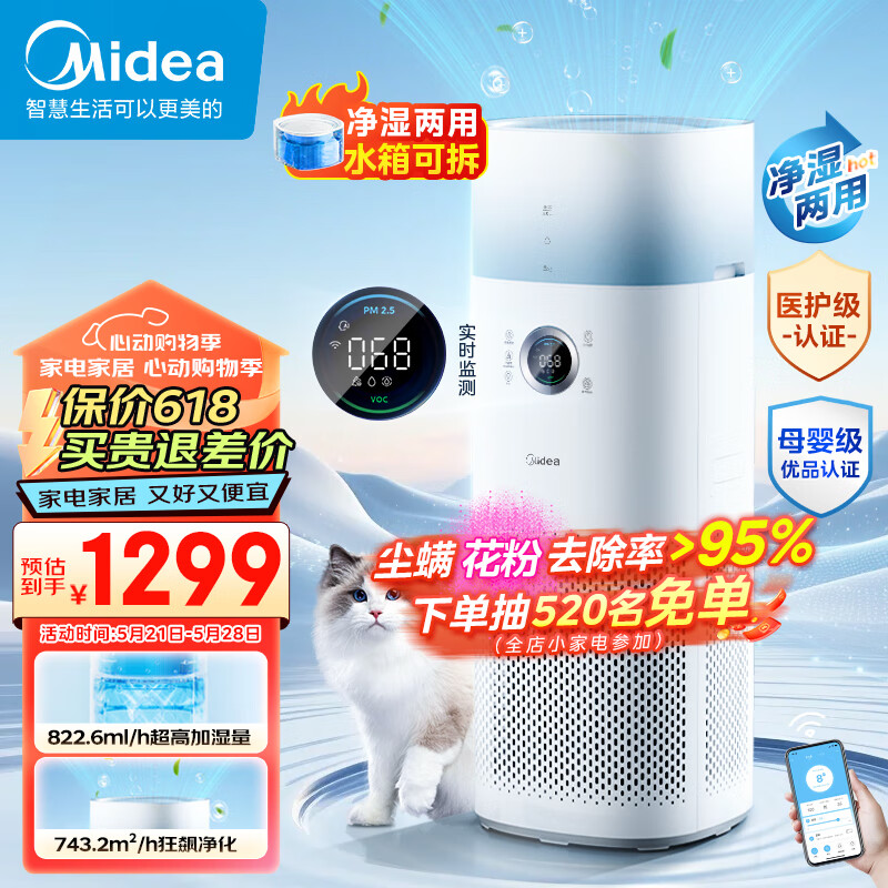 美的(Midea)【医护级+母婴优品双证】加湿空气净化器一体机八重净化除醛除异味低噪99.99%除菌消毒宠物净化器价格:1399.00元!