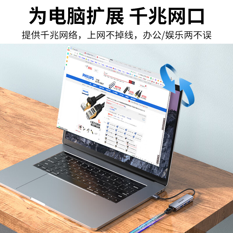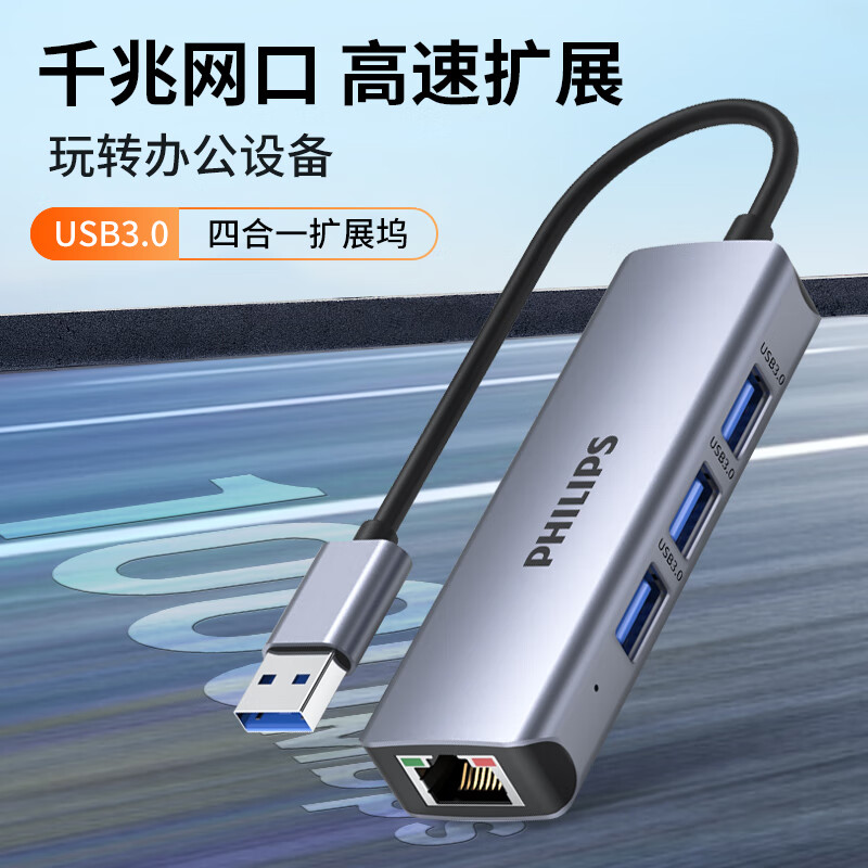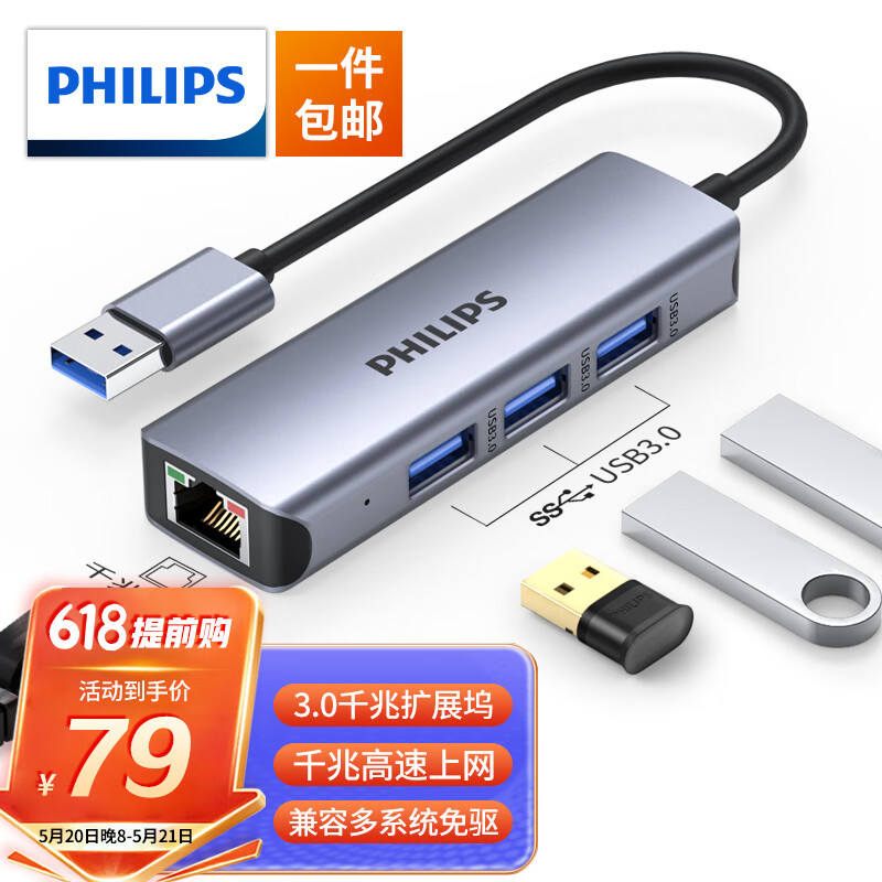 飞利浦USB3.0转千兆网口扩展坞分线器笔记本网线转接头RJ45接口网卡转换器适用苹果华为联想电脑拓展坞价格:99.00元!