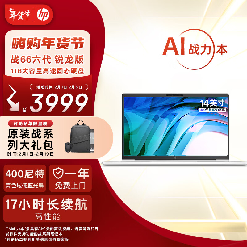 惠普(HP)战66 六代 锐龙版14英寸轻薄笔记本电脑(锐龙高性能R7 16G 1TB 长续航 高色域低蓝光 AI新体验)价格:3999.00元!