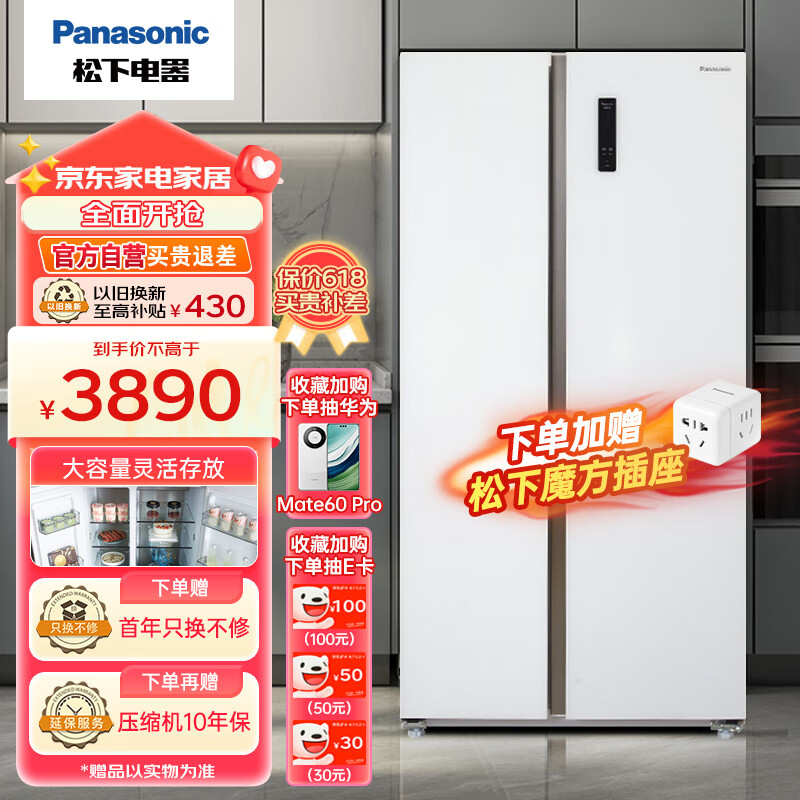 松下(Panasonic)冰箱632升双开门冰箱90°悬停风冷无霜磨砂玻璃面板白色优选冰箱NR-TB63GPB-W【以旧换新】价格:3890.00元!
