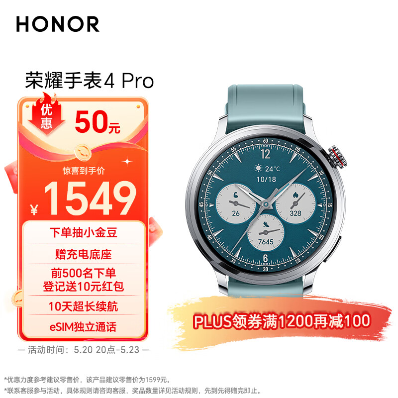 荣耀手表4 Pro 青色 超窄边常亮屏 10天eSIM超长续航 心率血氧监测 运动智能手表 龙年表盘新年礼物价格:1549.00元!