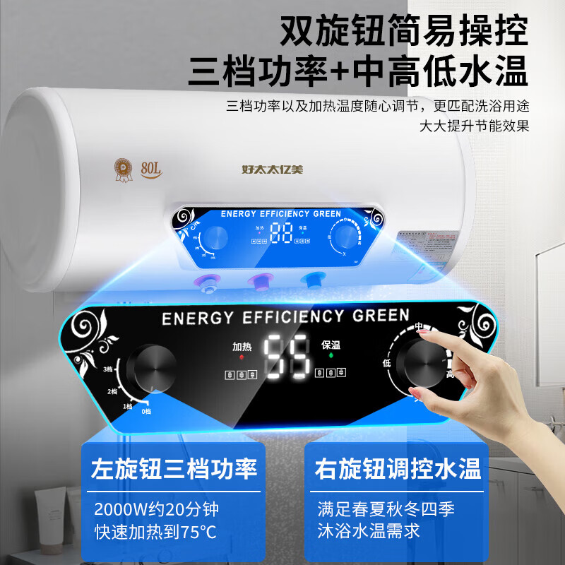 好太太亿美热水器电热水器速热圆桶80升一级能效2000W卫生间洗澡家用出租房小型热水器DSZF-80A 上门安装价格:438.00元!