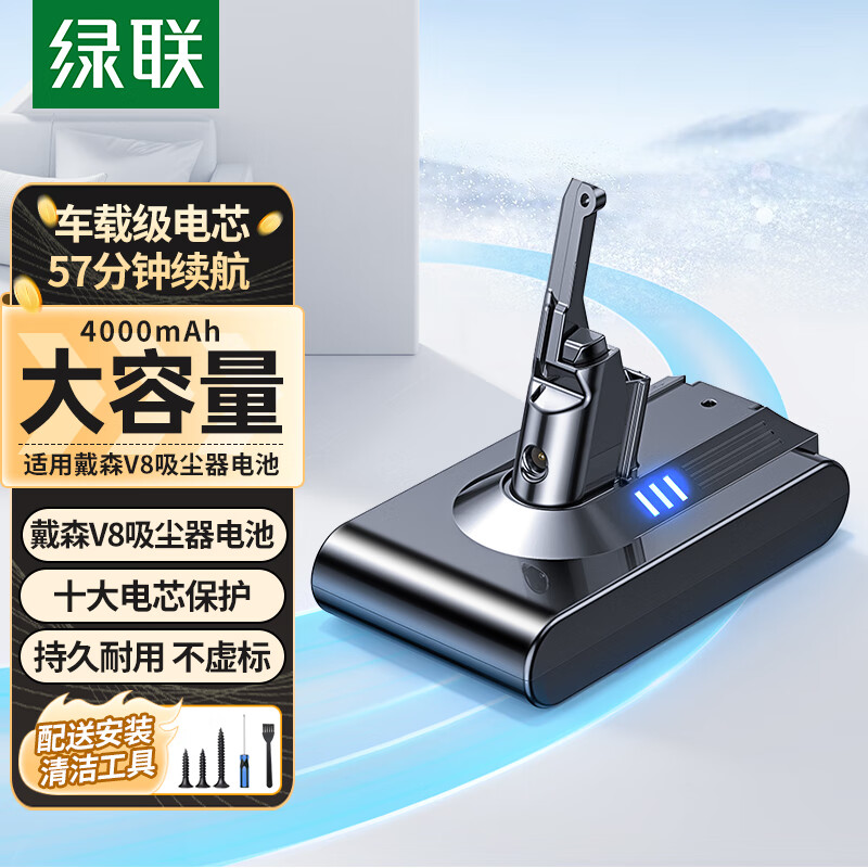 绿联(UGREEN)4000mAh适用戴森Dyson吸尘器V8电池 大容量锂电池充电V8Fluffy/Absolute/Animal Pro/PM8.SV10型号价格:399.00元!