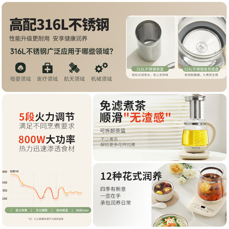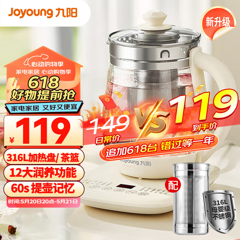 九阳(Joyoung)1.5L养生壶 煮茶器煮茶壶 316L不锈钢电水壶 保温花茶壶烧水壶 带滤网 K15D-WY303价格:119.00元!