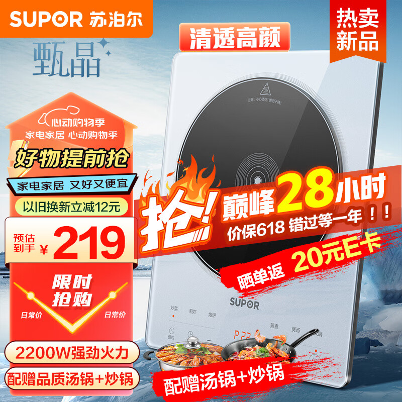苏泊尔(SUPOR)甄晶透彩电磁炉家用 2200W大功率 电磁灶火锅炉 爆炒炒菜 智能预约 电磁炉套装全套带锅C22-IA616价格:219.00元!