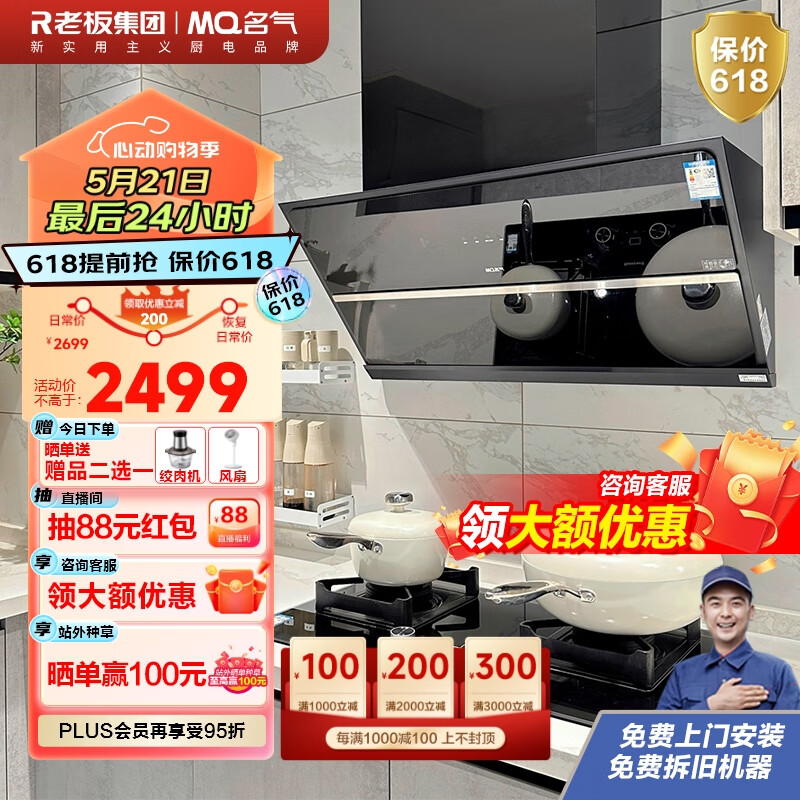 名气(MQ)老板抽油烟机侧吸变频油烟机灶具S1烟灶套装家用24大吸力960Pa静压燃气灶套装A3801+B510Y液化气价格:2699.00元!