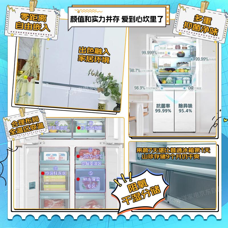海尔(Haier)白巧475L十字双开四开门风冷无霜全空间保鲜超薄零嵌入底部散热一级能效冰箱BCD-475WGHTD1BGZU1价格:6449.00元!