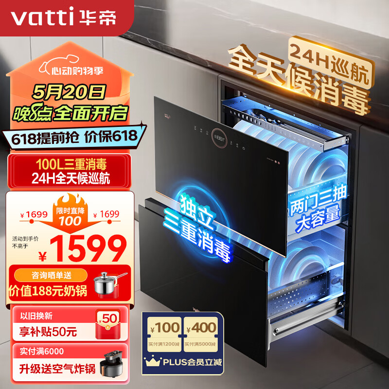 华帝(VATTI)消毒柜家用嵌入式 100升大容量两门三抽消毒碗柜 24H全天候巡航紫外线高温三重消毒i13036价格:1699.00元!