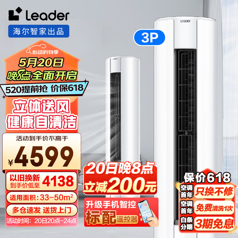 Leader空调海尔出品大3匹立式空调 一级能效变频节能冷暖家用客厅自清洁柜机空调以旧换新WDB81TU1[家电]价格:4799.00元!