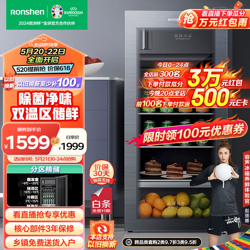 容声(Ronshen) 126升小型迷你厅吧 家用客厅办公室冰吧 一级能效 茶叶柜冷藏除菌净味 玻璃门冷柜JC-126RSY价格:1699.00元!