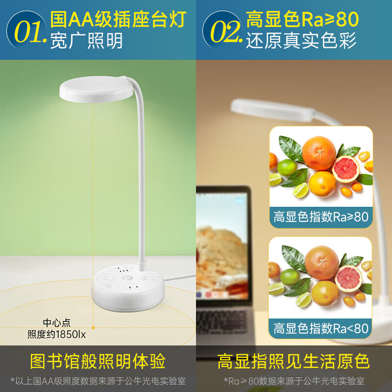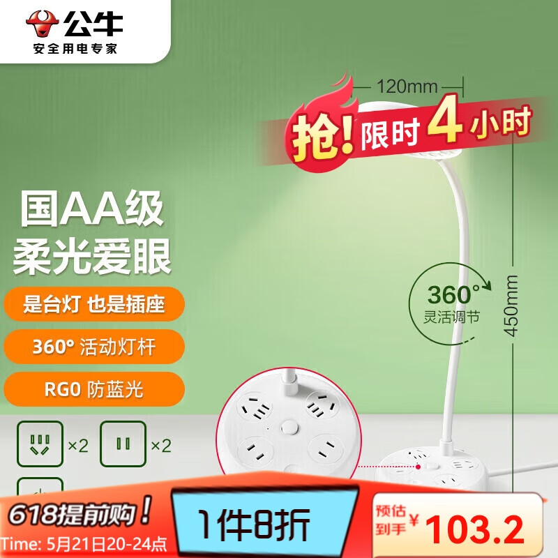 公牛(BULL)台灯国AA级双重防眩GN-X1220宿舍卧室床头灯四插位插座台灯价格:129.00元!