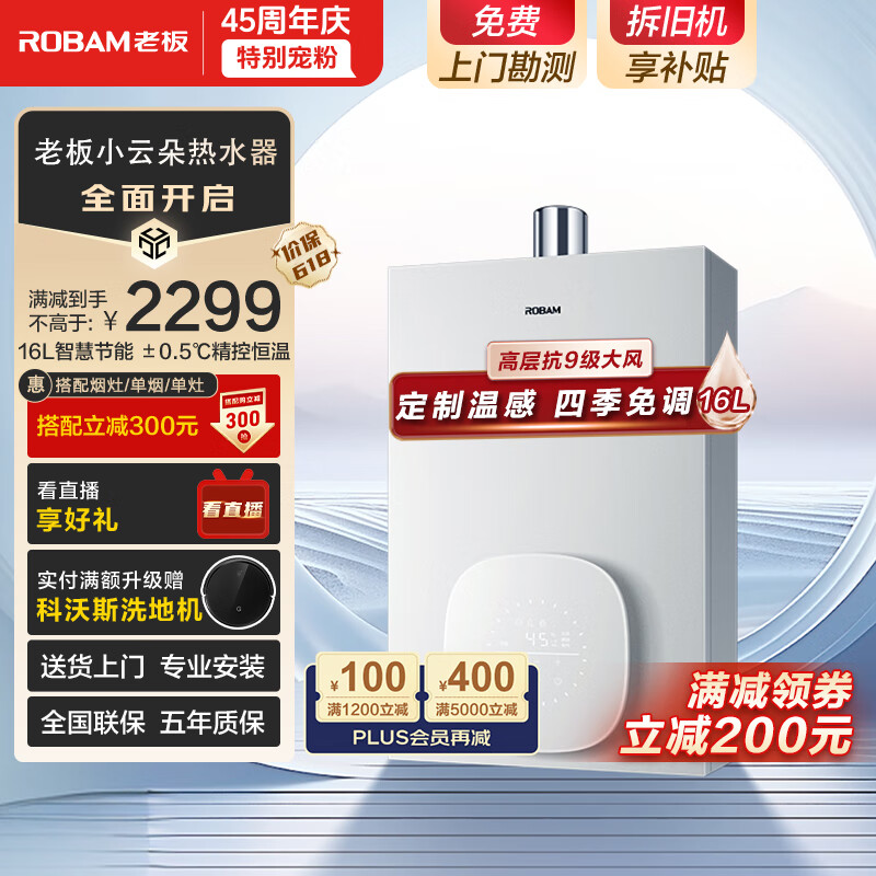 老板(Robam)小云朵16升燃气热水器天然气匀氧稳燃小尺寸智能恒温降噪高层抗风防冻家用强排式JSQ31-HT322A-16价格:2499.00元!