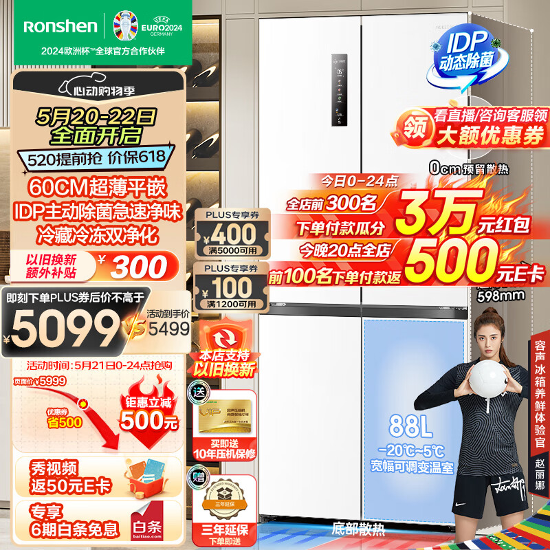 容声(Ronshen)509升双净平嵌冰箱十字对开四开门60cm超薄嵌入式白色家用大容量底部散热BCD-509WD2FPQLA变温价格:5999.00元!