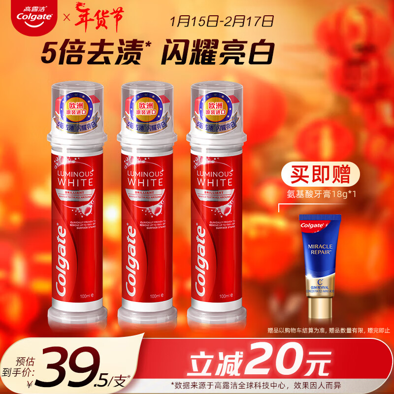 高露洁(Colgate)欧洲进口耀白去渍直立按压式泵式美白牙膏*3 5倍去渍闪耀亮白价格:169.00元!