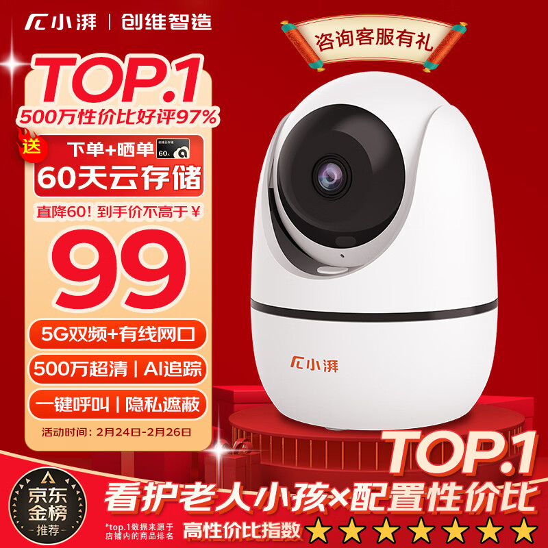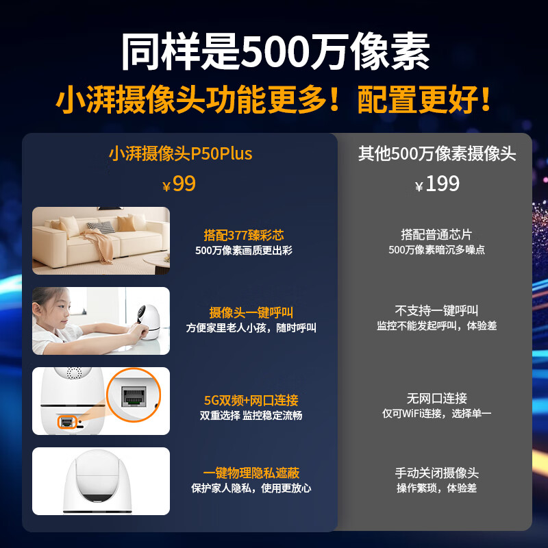 小湃500万双频摄像头家用监控P50Plus 家庭室内监控器360度无死角带夜视全景 手机远程监控看护监护器价格:99.00元!