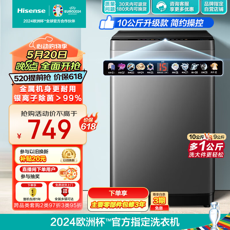 海信(Hisense)波轮洗衣机全自动 10公斤升级大容量波轮 银离子除菌 家用宿舍 除螨炫彩标识HB100DFC58以旧换新价格:749.00元!