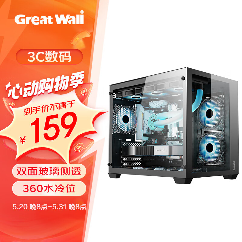 长城(Great Wall)海王星T6海景房机箱(双面玻璃全侧透/MATX主板/独立360水冷位/9风扇位/顶部防尘网)价格:159.00元!