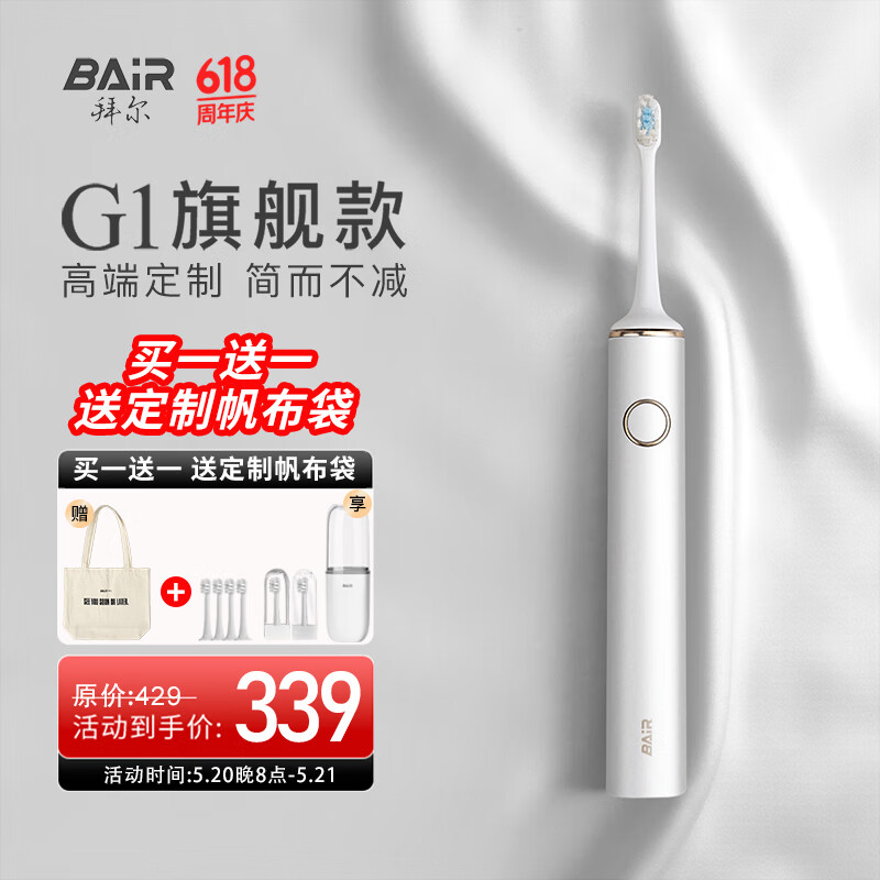 拜尔G1 豪华定制版电动牙刷成人充电智能声波便携情侣款套装自动男女士 送朋友 礼盒装 月光白价格:399.00元!