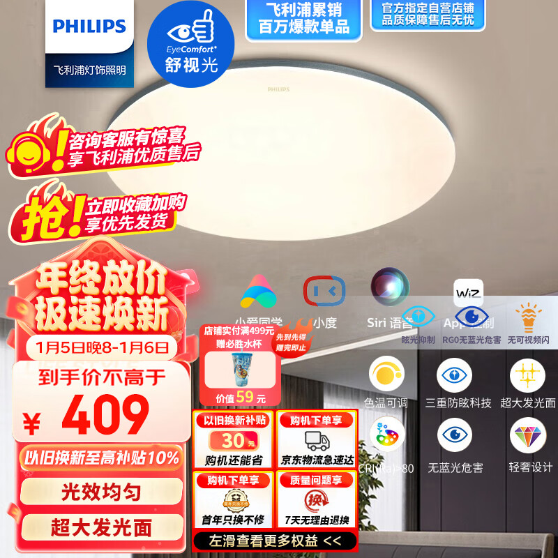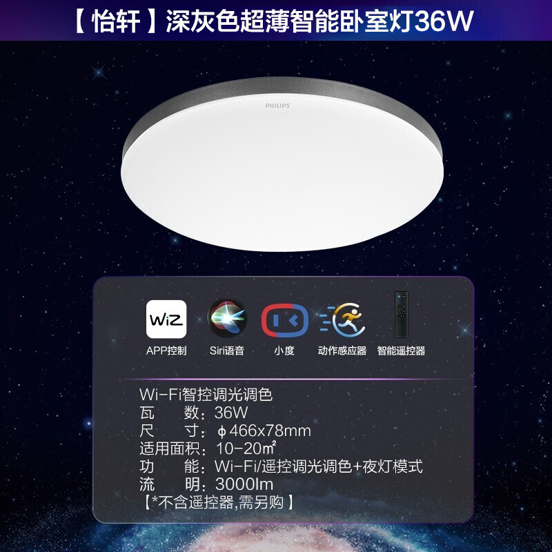 飞利浦led吸顶灯智能卧室书房餐厅现代简约灯具灯饰智控调光36W 怡轩灰价格:799.00元!